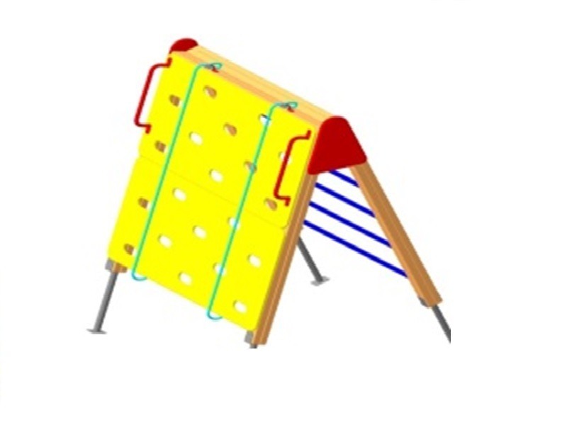 Гимнастический комплекс представляет собой сборноразборную, модульную конструкцию, состоящую из четырех опорных столбов, закладного бруса, скалолаза, распорных турников, ручки-держателя и фанерных фиксаторов. Оборудование устанавливается и бетонируется на оцинкованные металлические подпятники. Возраст пользователя от 6 до 12 лет. Опорные столбы и закладной брус выполнены из клееного бруса сечением не менее 100*100 мм. с канавкой посередине. Металлические подпятники выполнены из круглой трубы сечением не менее 42 мм. и листового металла толщиной не менее 4 мм. Распорные турники выполнены из круглой трубы сечением не менее 34 мм., листового металла толщиной не менее 4 мм. Ручка-держатель выполнена из круглой трубы сечением не менее 27 мм. и листового металла толщиной не менее 4 мм. Скалолаз и фиксаторы выполнены из влагостойкой фанеры толщиной не менее 24 мм.  Все металлические и фанерные элементы выполнены с применением высокоточного оборудования. Деревянные элементы изготавливаются на полуавтоматизированной линии по обработке деревянных изделий. Все деревянные элементы изготавливаются из хвойной доски влажностью 7-10%, подвергаемой склейке по длине и ширине заготовки с применением клеев зарубежных производителей; изгибы, радиусы и скругленные кромки тщательно отшлифованы и обработаны краской для закрытия торцов JRM (ГОСТ Р 52169-2012 п.4.3.11). Все деревянные элементы проходят окраску в три слоя: первый слой – грунтование заготовки с последующим шлифованием поверхности, второй слой – покраска вододисперсионной краской с последующим шлифованием поверхности, третий слой – финишная покраска. Все деревянные элементы окрашиваются краской финского производителя TEKNOS, соответствующей требованиям санитарных норм и экологической безопасности. Все металлические элементы изготавливаются из круглых труб, с применением горячекатаного листа. Весь применяемый металлопрокат соответствует ГОСТ 10705-80, ГОСТ 1577-93. Сварные швы конструкций из металла гладкие (ГОСТ Р 52169-2012 п.4.3.10). Все металлические элементы окрашиваются порошковой краской финского производителя TEKNOS, соответствующей требованиям санитарных норм и экологической безопасности. Для более качественного прокраса все металлические элементы проходят двойной цикл покраски. Все фанерные элементы изготовлены из многослойной влагостойкой, склеенной под прессом и соответствующей ГОСТ 30427-96 фанеры; изгибы, радиусы и скругленные кромки тщательно отшлифованы и обработаны краской для закрытия торцов JRM (ГОСТ Р 52169-2012 п.4.3.11). Окраска фанерных элементов происходит в три слоя: первый слой – грунтование заготовки с последующим шлифованием поверхности, второй слой – покраска двухкомпонентной краской с последующим шлифованием поверхности, третий слой – финишная покраска. Все фанерные элементы окрашиваются краской финского производителя TEKNOS, соответствующей требованиям санитарных норм и экологической безопасности. Крепеж оцинкован. Выступающие части резьбовых соединений закрыты пластиковыми заглушками (ГОСТ Р 52169-2012 п. 4.3.9). Крепление элементов оборудования исключает возможность их демонтажа без применения инструментов (ГОСТ Р 52169-2012 п. 4.3.13). Изделие сопровождается: а) техническим паспортом завода-изготовителя (ГОСТ Р 52301-2004 п. 5), в котором указано предназначение, номер изделия, правила безоп
