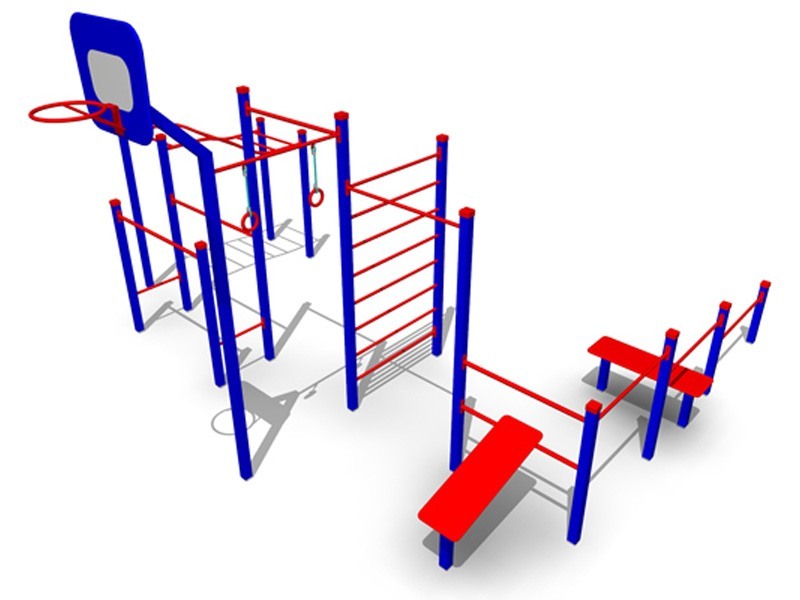 Гимнастический комплекс представляет собой сборноразборную, модульную конструкцию, состоящую из тринадцати металлических опорных столбов, гимнастических брусьев, баскетбольной стойки, баскетбольного щита с кольцом, двух скамей, рукохода, турника под гимнастические кольца, распорных турников и гимнастических колец. На вершины столбов устанавливаются пластиковые заглушки. Оборудование устанавливается и бетонируется на оцинкованные металлические подпятники. Возраст пользователя от 10 до 14 лет. Опорные столбы и баскетбольная стойка выполнены из профильной трубы сечением не менее 80*80 мм. и листового металла толщиной не менее 6 мм. Рукоход, гимнастические брусья и распорные турники выполнены из круглой трубы сечением не менее 42 мм. и листового металла толщиной не менее 4 мм. Турник под гимнастические кольца выполнен из круглой трубы сечением не менее 34 мм. и листового металла толщиной не менее 4 мм. Баскетбольный щит и скамьи выполнены из влагостойкой фанеры толщиной не менее 24 мм. Баскетбольное кольцо выполнено из круглой трубы сечением не менее 21 мм. и листового металла толщиной не менее 4 мм. Гимнастические кольца выполнены из влагостойкой фанеры толщиной не менее 24 мм. и полипропиленового каната с металлическим сердечником сечением не менее 16 мм. Все металлические и фанерные элементы выполнены с применением высокоточного оборудования. Все металлические элементы изготавливаются из круглых и профильных труб, с применением горячекатаного листа. Весь применяемый металлопрокат соответствует ГОСТ 8639-82, ГОСТ 10705-80, ГОСТ 1577-93. Сварные швы конструкций из металла гладкие (ГОСТ Р 52169-2012 п.4.3.10). Все металлические элементы окрашиваются порошковой краской финского производителя TEKNOS, соответствующей требованиям санитарных норм и экологической безопасности. Для более качественного прокраса все металлические элементы проходят двойной цикл покраски. Все фанерные элементы изготовлены из многослойной влагостойкой, склеенной под прессом и соответствующей ГОСТ 30427-96 фанеры; изгибы, радиусы и скругленные кромки тщательно отшлифованы и обработаны краской для закрытия торцов JRM (ГОСТ Р 52169-2012 п.4.3.11). Окраска фанерных элементов происходит в три слоя: первый слой – грунтование заготовки с последующим шлифованием поверхности, второй слой – покраска двухкомпонентной краской с последующим шлифованием поверхности, третий слой – финишная покраска. Все фанерные элементы окрашиваются краской финского производителя TEKNOS, соответствующей требованиям санитарных норм и экологической безопасности. Крепеж оцинкован. Выступающие части резьбовых соединений закрыты пластиковыми заглушками (ГОСТ Р 52169-2012 п. 4.3.9). Крепление элементов оборудования исключает возможность их демонтажа без применения инструментов (ГОСТ Р 52169-2012 п. 4.3.13). Изделие сопровождается: а) техническим паспортом завода-изготовителя (ГОСТ Р 52301-2004 п. 5), в котором указано предназначение, номер изделия, правила безопасной эксплуатации и схема сборки. б) комплектом крепежа для сборки и монтажа. Сборочно-монтажные работы выполняются с соблюдением требований национальных стандартов по установке детского игрового оборудования и согласно схемам монтажа предприятия-изготовителя.