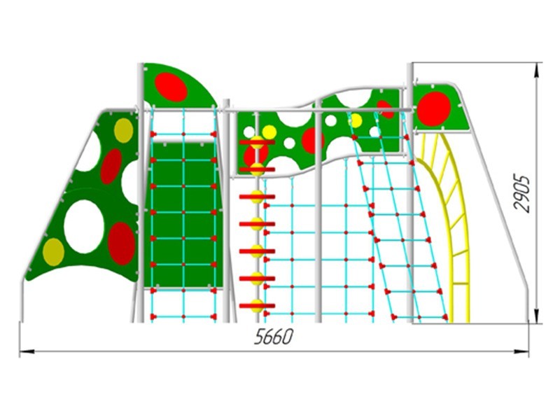 Гимнастический комплекс, имеет сборно-разборную конструкцию посредством фланцевого крепления. Гимнастический комплекс включает в себя четыре опоры, наклонный скалолаз, прямой скалолаз, волнистый скалолаз, боковую стойку, гимнастическую стенку, дуговую часть, шест для спуска «Юла», верхнюю фанеру и три сетки. Оборудование устанавливается и бетонируется в грунт. Возраст пользователя от 10 до 14 лет. Опоры выполнены из круглой трубы сечением  не менее 76 мм. и листового металла толщиной не менее 6 мм. Наклонный скалолаз, прямой скалолаз, волнистый скалолаз,  боковая стойка и шест для спуска «Юла» выполнены из круглой трубы сечением  не менее 42 мм., листового металла толщиной не менее 6 мм. и влагостойкой фанеры толщиной не менее 24 мм. Гимнастическая стенка и дуговая часть выполнены из круглой трубы сечением  не менее 42 мм. и листового металла толщиной не менее 6 мм. Сетки выполнены из полипропиленового каната с металлическим сердечником сечением не менее 16 мм., равнополочного уголка сечением не менее 25*25 мм. и специальных крепежных метизов. Верхняя фанера выполнена из влагостойкой фанеры толщиной не менее 24 мм. Все металлические и фанерные элементы выполнены с применением высокоточного оборудования. Все металлические элементы изготавливаются из круглых труб, с применением горячекатаного листа. Весь применяемый металлопрокат соответствует ГОСТ 8509-93, ГОСТ 10705-80, ГОСТ 1577-93. Сварные швы конструкций из металла гладкие (ГОСТ Р 52169-2012 п.4.3.10). Все металлические элементы окрашиваются порошковой краской финского производителя TEKNOS, соответствующей требованиям санитарных норм и экологической безопасности. Для более качественного прокраса все металлические элементы проходят двойной цикл покраски. Все фанерные элементы изготовлены из многослойной влагостойкой, склеенной под прессом и соответствующей ГОСТ 30427-96 фанеры; изгибы, радиусы и скругленные кромки тщательно отшлифованы и обработаны краской для закрытия торцов JRM (ГОСТ Р 52169-2012 п.4.3.11). Окраска фанерных элементов происходит в три слоя: первый слой – грунтование заготовки с последующим шлифованием поверхности, второй слой – покраска двухкомпонентной краской с последующим шлифованием поверхности, третий слой – финишная покраска. Все фанерные элементы окрашиваются краской финского производителя TEKNOS, соответствующей требованиям санитарных норм и экологической безопасности. Крепеж оцинкован.Выступающие части резьбовых соединений закрыты пластиковыми заглушками (ГОСТ Р 52169-2012 п. 4.3.9). Крепление элементов оборудования исключает возможность их демонтажа без применения инструментов (ГОСТ Р 52169-2012 п. 4.3.13). Изделие сопровождается: а) техническим паспортом завода-изготовителя (ГОСТ Р 52301-2004 п. 5), в котором указано предназначение, номер изделия, правила безопасной эксплуатации и схема сборки. б) комплектом крепежа для сборки и монтажа. Сборочно-монтажные работы выполняются с соблюдением требований национальных стандартов по установке детского игрового оборудования и согласно схемам монтажа предприятия-изготовителя.