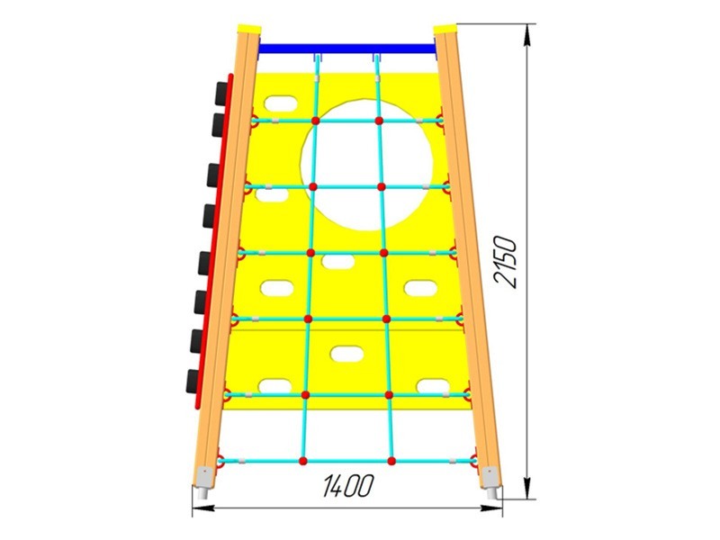 Гимнастический комплекс представляет собой сборноразборную, модульную конструкцию, состоящую из четырех опорных столбов, лестницы-стремянки, сетки, скалолаза, скалолаза с зацепами и распорных турников. Оборудование устанавливается и бетонируется на оцинкованные металлические подпятники. Возраст пользователя от 4 до 7 лет.         Опорные столбы выполнены из клееного бруса сечением не менее 100*100 мм. с канавкой посередине. Металлические подпятники выполнены из круглой трубы сечением не менее 42 мм. и листового металла толщиной не менее 4 мм. Распорные турники из круглой трубы сечением не менее 27 мм., листового металла толщиной не менее 4 мм. Скалолазы выполнены из влагостойкой фанеры толщиной не менее 18 мм. Стремянка выполнена из полипропиленового каната с металлическим сердечником сечением не менее 16 мм., равнополочного уголка сечением не менее 25*25 мм., штампованных пластиковых ступеней. Сетки для лазания из полипропиленового каната с металлическим сердечником сечением не менее 16 мм., специальных крепежных метизов и штампованных пластиковых элементов. Все металлические и фанерные элементы выполнены с применением высокоточного оборудования. Деревянные элементы изготавливаются на полуавтоматизированной линии по обработке деревянных изделий.Все деревянные элементы изготавливаются из хвойной доски влажностью 7-10%, подвергаемой склейке по длине и ширине заготовки с применением клеев зарубежных производителей; изгибы, радиусы и скругленные кромки тщательно отшлифованы и обработаны краской для закрытия торцов JRM (ГОСТ Р 52169-2012 п.4.3.11). Все деревянные элементы проходят окраску в три слоя: первый слой – грунтование заготовки с последующим шлифованием поверхности, второй слой – покраска вододисперсионной краской с последующим шлифованием поверхности, третий слой – финишная покраска. Все деревянные элементы окрашиваются краской финского производителя TEKNOS, соответствующей требованиям санитарных норм и экологической безопасности.Все металлические элементы изготавливаются из круглых труб, с применением горячекатаного листа. Весь применяемый металлопрокат соответствует ГОСТ 10705-80, ГОСТ 1577-93. Сварные швы конструкций из металла гладкие (ГОСТ Р 52169-2012 п.4.3.10). Все металлические элементы окрашиваются порошковой краской финского производителя TEKNOS, соответствующей требованиям санитарных норм и экологической безопасности. Для более качественного прокраса все металлические элементы проходят двойной цикл покраски. Все фанерные элементы изготовлены из многослойной влагостойкой, склеенной под прессом и соответствующей ГОСТ 30427-96 фанеры; изгибы, радиусы и скругленные кромки тщательно отшлифованы и обработаны краской для закрытия торцов JRM (ГОСТ Р 52169-2012 п.4.3.11). Окраска фанерных элементов происходит в три слоя: первый слой – грунтование заготовки с последующим шлифованием поверхности, второй слой – покраска двухкомпонентной краской с последующим шлифованием поверхности, третий слой – финишная покраска. Все фанерные элементы окрашиваются краской финского производителя TEKNOS, соответствующей требованиям санитарных норм и экологической безопасности.Крепеж оцинкован. Выступающие части резьбовых соединений закрыты пластиковыми заглушками (ГОСТ Р 52169-2012 п. 4.3.9).Крепление элементов оборудования исключает возможность их демонт