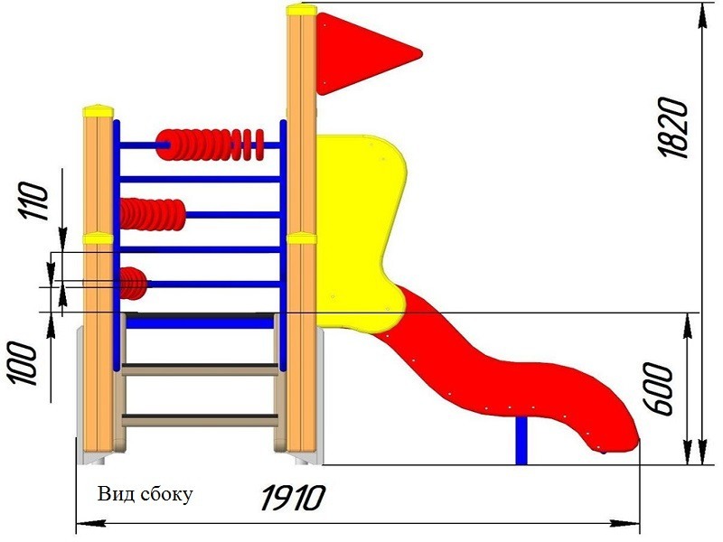 Горка представляет собой сборноразборную, модульную конструкцию, состоящую из шести опорных столбов, одной площадки, одного лестничного марша, четырех перил к лестничному маршу , одного ската горки высотой стартового участка 600 мм., фанерных ограждений к горке, флага, ограждений в сборе со счетами. На вершины столбов устанавливаются пластиковые заглушки. Оборудование устанавливается и бетонируется на оцинкованные металлические подпятники. Возраст пользователя от 3 лет.   Опорные столбы выполнены из клееного бруса сечением не менее 100*100 мм. с канавкой посередине. Пол горки состоит из металлического каркаса,  выполненным из профильной трубы сечением не менее 20*25 мм. толщиной стенки  не менее 1,5 мм.и пола из влагостойкой фанеры толщиной не менее 15 мм. Металлические подпятники, выполнены из круглой трубы сечением не менее 42 мм. и листового металла толщиной не менее 4 мм. Подпятники к лестничному маршу выполнены из профильной трубы сечением не менее 40*20 мм. и листового металла толщиной 4 мм. Лестничный марш выполнен из хвойной доски влажностью 7-10%  сечением не менее 140*35 мм. и фанеры толщиной не менее 15 мм. Перила к лестничному маршу выполнены из хвойной доски влажностью 7-10%  сечением не менее 140*45 мм. Скат горки выполнен из влагостойкой фанеры толщиной не менее 24 мм. и единого листа нержавеющей стали толщиной не менее 1,5 мм. Скат горки имеет металлический каркас, выполненный из профильной трубы сечением не менее 20*40 мм. Стартовый участок горки имеет ограждения, выполненные из влагостойкой фанеры толщиной не менее 24 мм. и турник – ограничитель, выполненный из круглой трубы сечением не менее 27 мм. и листового металла толщиной 4 мм. Ограждения выполнены из фанеры толщиной не менее 24 мм. Ограждение к полу изготовлено  из трубы сечением не менее 21,5 мм., листового металла толщиной 4 мм. и счет из влагостойкой фанеры толщиной не менее 15 мм. Все металлические элементы выполнены с применением высокоточного оборудования. Деревянные и фанерные элементы изготавливаются на полуавтоматизированной линии по обработке деревянных и фанерных изделий.   Все деревянные элементы изготавливаются из хвойной доски влажностью 7-10%, подвергаемой склейке по длине и ширине заготовки с применением клеев зарубежных производителей; изгибы, радиусы и скругленные кромки тщательно отшлифованы и обработаны краской для закрытия торцов JRM (ГОСТ Р 52169-2003 п.4.3.11). Все деревянные элементы проходят окраску в три слоя: первый слой – грунтование заготовки с последующим шлифованием поверхности, второй слой – покраска вододисперсионной краской с последующим шлифованием поверхности, третий слой – финишная покраска. Все деревянные элементы окрашиваются краской финского производителя TEKNOS, соответствующей требованиям санитарных норм и экологической безопасности. Все металлические элементы изготавливаются из круглых труб, с применением горячекатаного листа. Весь применяемый металлопрокат соответствует ГОСТ 8639-82, ГОСТ 10705-80, ГОСТ 1577-93. Сварные швы конструкций из металла гладкие (ГОСТ Р 52169-2012 п.4.3.10). Все металлические элементы окрашиваются порошковой краской финского производителя TEKNOS, соответствующей требованиям санитарных норм и экологической безопасности. Для более качественного прокраса все металлические элементы проходят двойной цикл покраски. Все фанерные элемент