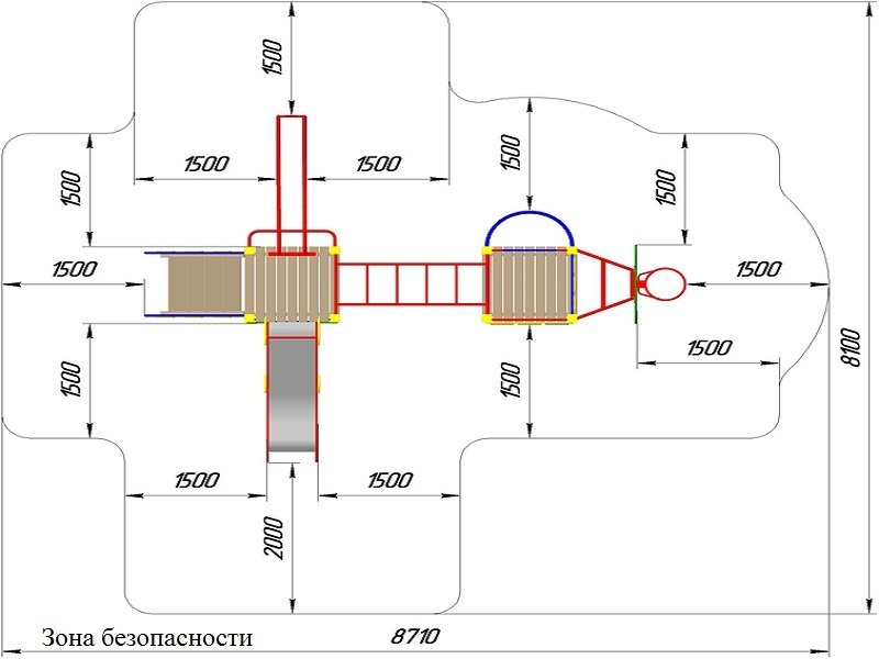 Игровой комплекс представляет собой сборноразборную, модульную конструкцию, состоящую из восьми опорных столбов, двух разновысоких площадок, одного лестничного марша, двух перил к лестничному маршу, выполненных в виде металлического каркаса с фанерными экранами, одного ската горки с высотой стартового участка 950 мм, одного снаряда «скалолаз» со стойкой для подъема, одного ограждения, выполненного в виде металлического каркаса с фанерными экранами, баскетбольного щита с кольцом и креплением к опорным столбам, шеста для спуска с ручками, наклонного рукохода с ручками, снаряда для съезжания с ручкой, турников. На вершины столбов устанавливаются пластиковые заглушки. Оборудование устанавливается и бетонируется на оцинкованные металлические подпятники. Возраст пользователя от 5 лет.   Опорные столбы выполнены из клееного бруса сечением не менее 100*100 мм с канавкой посередине. Площадки выполнены из доски сечением не менее 100*40 мм. Металлические подпятники, выполнены из круглой трубы сечением не менее 42 мм и листового металла толщиной не менее 4 мм. Лестничный марш выполнен из сухой доски сечением не менее 140*40 мм. Перила к лестничному маршу выполнены из круглой трубы сечением не менее 27 мм, листового металла толщиной не менее 4 мм и фанеры толщиной не менее 15 мм. Скат горки выполнен из фанеры толщиной не менее 24 мм и единого листа нержавеющей стали толщиной не менее 1,5 мм. Скат горки имеет металлический каркас, выполненный из профильной трубы сечением не менее 20*40 мм. Стартовый участок горки имеет ограждения, выполненные из фанеры толщиной 24 мм и имеет турник – ограничитель, выполненный из круглой трубы сечением не менее 27 мм и листового металла толщиной 4 мм. Снаряд «скалолаз» выполнен из фанеры толщиной не менее 24 мм. Стойка для подъема имеет п-образную форму и выполнена из круглой трубы сечением не менее 27 мм и листового металла толщиной 4 мм. Ограждение выполнено из круглой трубы сечением не менее 27 мм, листового металла толщиной не менее 4 мм и фанеры толщиной не менее 15 мм. Баскетбольный щит выполнен из фанеры толщиной не менее 24 мм. Баскетбольное кольцо выполнено из круглой трубы сечением не менее 21 мм и листового металла толщиной не менее 4 мм. Крепление баскетбольного щита выполнено из круглой трубы сечением не менее 42 мм, профильной трубы сечением не менее 40*20 мм и листового металла толщиной не менее 6 мм. Шест для спуска выполнен из круглой трубы сечением не менее 42 мм и листового металла толщиной не менее 4 мм. Ручки выполнены из круглой трубы сечением не менее 27 мм и листового металла толщиной не менее 4 мм. Наклонный рукоход выполнен из круглой трубы сечением не менее 34 мм и листового металла толщиной не менее 4 мм. Ручки выполнены из круглой трубы сечением не менее 27 мм и листового металла толщиной не менее 4 мм. Снаряд для съезжания имеет зигзагообразную форму и выполнен из круглой трубы сечением не менее 42 мм и листового металла толщиной не менее 4 мм. Ручка выполнена из круглой трубы сечением не менее 34 мм и листового металла толщиной 4 мм. Турники выполнены из круглой трубы сечением не менее 27 мм и листового металла толщиной 4 мм. Все металлические элементы выполнены с применением высокоточного оборудования. Деревянные и фанерные элементы изготавливаются на полуавтоматизированной линии по обработке деревянных и фанерны
