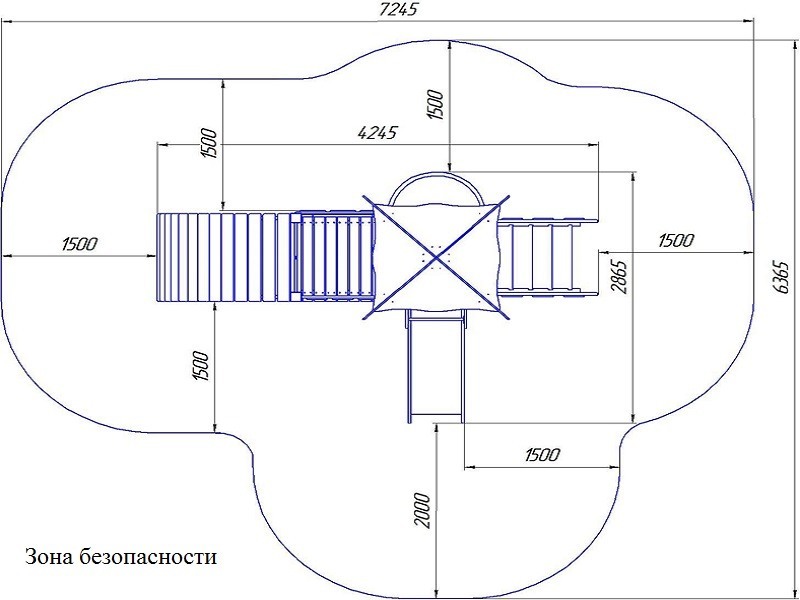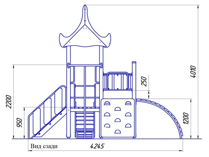 Игровой комплекс представляет собой сборноразборную, модульную конструкцию, состоящую из шести опорных столбов, две разноуровневые площадки, одной башни под шатровой крышей, одного шеста для спуска с ручками, одного ограждения, выполненного в виде металлического каркаса с фанерными экранами, одного ската горки с высотой стартового участка не менее 950мм, одного лестничного марша с двумя перилами, выполненными в виде металлического каркаса с фанерными экранами, одного снаряда для подъема «трап» с полипропиленовым канатом, одного снаряда «скалолаз» со стойкой для подъема ,турников. Оборудование устанавливается и бетонируется на оцинкованные металлические подпятники. Возраст пользователя от 5 лет.   Опорные столбы выполнены из клееного бруса сечением не менее 100мм*100мм с канавкой посередине. Площадки выполнены из доски сечением не менее 100мм*40мм. Металлические подпятники, выполнены из круглой трубы сечением не менее 42мм и листового металла толщиной не менее 4мм. Шатровая крыша выполнена из фанеры толщиной не менее 15мм и листового металла толщиной 4мм. Лестничный марш выполнен из сухой доски сечением не менее 140мм*40мм. Перила к лестничному маршу выполнены из круглой трубы сечением не менее 27мм, листового металла толщиной не менее 4мм и фанеры толщиной не менее 15мм. Ограждение выполнено из круглой трубы сечением не менее 27мм, листового металла толщиной не менее 4мм и фанеры толщиной не менее 15мм. Скат горки выполнен из фанеры толщиной не менее 24мм и единого листа нержавеющей стали толщиной не менее 1,5мм. Скат горки имеет металлический каркас, выполненный из профильной трубы сечением не менее 20мм*40мм. Стартовый участок горки имеет ограждения, выполненные из фанеры толщиной 24мм и имеет турник – ограничитель, выполненный из круглой трубы сечением не менее 27мм и листового металла толщиной 4мм. Шест для спуска выполнен из круглой трубы сечением не менее 42мм и листового металла толщиной не менее 4мм. Ручки выполнены из круглой трубы сечением не менее 27мм и листового металла толщиной не менее 4мм. Снаряд «трап» выполнен в виде металлического каркаса с досками. Каркас выполнен из круглой трубы сечением не менее 42мм и листового металла толщиной не менее 4мм, доски выполнены из сухой доски сечением не менее 120мм*40мм. Полипропиленовый канат фиксируется между столбов при помощи распорного турника с петлей, выполненного из круглой трубы сечением не менее 27мм и листового металла толщиной не менее 4мм. Снаряд «скалолаз» выполнен из фанеры толщиной не менее 24мм. Стойка для подъема имеет п-образную форму и выполнена из круглой трубы сечением не менее 27мм и листового металла толщиной 4мм. Турники выполнены из круглой трубы сечением не менее 27мм и листового металла толщиной 4мм.  Все металлические элементы выполнены с применением высокоточного оборудования. Деревянные и фанерные элементы изготавливаются на полуавтоматизированной линии по обработке деревянных и фанерных изделий.   Все деревянные элементы изготавливаются из хвойной доски влажностью 7-10%, подвергаемой склейке по длине и ширине заготовки с применением клеев зарубежных производителей; изгибы, радиусы и скругленные кромки тщательно отшлифованы и обработаны краской для закрытия торцов JRM (ГОСТ Р 52169-2003 п.4.3.11). Все деревянные элементы проходят окраску в три слоя: первый слой – гр