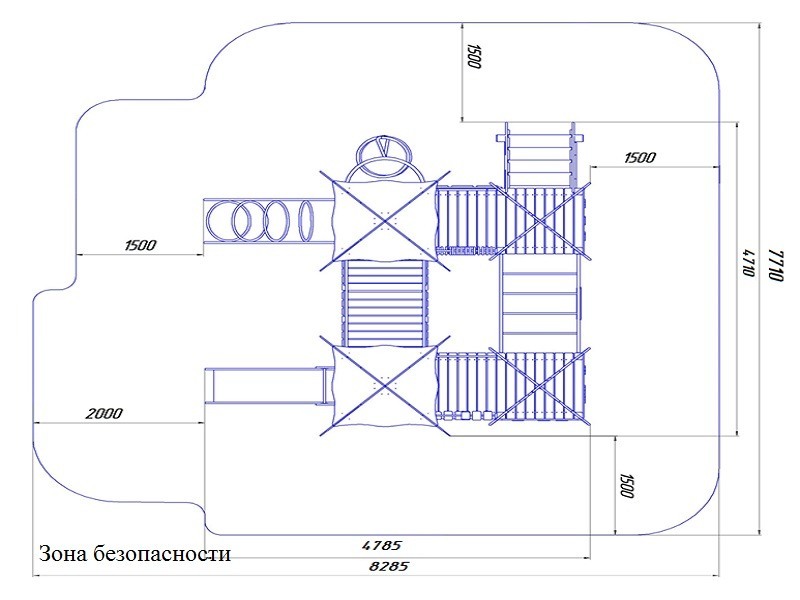 Игровой комплекс представляет собой сборноразборную, модульную конструкцию, состоящую из восемнадцати опорных столбов, четырех разноуровневых площадок, две из которых прямоугольной формы, остальные две квадратной формы, четырьмя башнями, две из которых под шатровыми крышами, остальные две имитируют листву дерева с декоративным филином на верхушке, одного лестничного марша, двух перил к лестничному маршу, выполненных в виде прыгающего зайца, трех ограждений с декоративными элементами в виде цветов, выполненных в виде фанерных экранов, одного ската горки с высотой стартового участка не менее 1200мм, одного дугового переходного пола с двумя перилами, выполненными в виде металлического каркаса с фанерными экранами,  одной гимнастической стенки из турников, двадцать фанерных счет, девяти кубиков для игры в крестики – нолики, одного шеста для спуска со спиралью с ручками, одного кольцевого снаряда для лазания с фанерным лазом, одного прямого рукахода с ручками и лестницей для подъема на полипропиленовых канатах с пластиковыми ступенями, двух снарядов «скалолаз» со стойкой для подъема, одной гимнастической стенки из турников. Оборудование устанавливается и бетонируется на оцинкованные металлические подпятники. Возраст пользователя от 7 лет.   Опорные столбы выполнены из клееного бруса сечением не менее 100мм*100мм с канавкой посередине. Площадки выполнены из доски сечением не менее 100мм*40мм. Металлические подпятники, выполнены из круглой трубы сечением не менее 42мм и листового металла толщиной не менее 4мм. Шатровая крыша выполнена из фанеры толщиной не менее 15мм и листового металла толщиной 4мм. Имитация крыши выполнена из фанеры толщиной не менее 24мм. Декоративный элемент в виде филина выполнен из фанеры толщиной не менее 24мм. Лестничный марш выполнен из сухой доски сечением не менее 140мм*40мм. Перила к лестничному маршу выполнены из фанеры толщиной не менее 24мм. Ограждения выполнены из фанеры толщиной не менее 24 мм. Декоративные элементы выполнены из фанеры толщиной не менее 9мм. Снаряд «скалолаз» выполнен из фанеры толщиной не менее 24мм. Стойка для подъема имеет п-образную форму и выполнена из круглой трубы сечением не менее 27мм и листового металла толщиной 4мм. Распорные турники гимнастической стенки выполнены из круглой трубы сечением 27мм и листового металла толщиной не менее 4мм. Скат горки выполнен из фанеры толщиной не менее 24мм и единого листа нержавеющей стали толщиной не менее 1,5мм. Скат горки имеет металлический каркас, выполненный из профильной трубы сечением не менее 20мм*40мм. Стартовый участок горки имеет ограждения, выполненные из фанеры толщиной 24мм и имеет турник – ограничитель, выполненный из круглой трубы сечением не менее 27мм и листового металла толщиной 4мм. Прямой рукаход выполнен из круглой трубы сечением не менее 34мм и листового металла толщиной не менее 4мм. Дуговой пол выполнен в виде металлического каркаса с досками и изготовлен из круглой трубы сечением не менее 42мм, листового металла толщиной не менее 4мм и доски сечением не менее 100мм*40мм. Перила к дуговому полу изготовлены из круглой трубы сечением не менее 34мм, листового металла толщиной не менее 4мм и фанеры толщиной 15мм. Счеты выполнены из фанеры толщиной не менее 24мм. Кубики выполнены из клееного бруса сечением не менее 100мм*10мм.  Шест для 