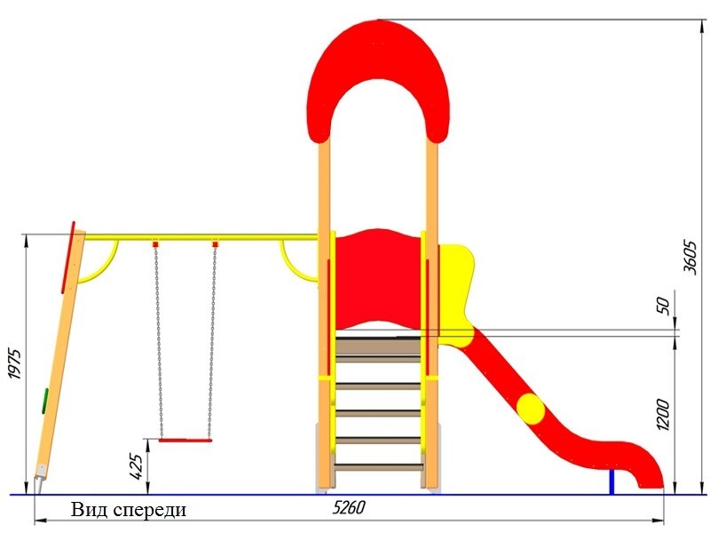 Игровой комплекс представляет собой сборноразборную, модульную конструкцию, состоящую из восьми опорных столбов, одной площадки, одной башни под двухскатной крышей с фронтонами, одного лестничного марша, двух перил к лестничному маршу, выполненных в виде деревянного каркаса с фанерными экранами, одного ограждения, выполненного в виде металлического каркаса с фанерными экранами, одного фанерного ограждения, одного основания подвеса, одного гибкого подвеса,  одного ската горки с высотой стартового участка не менее 1450мм, одного фиксатора и одной распорной фанеры. Оборудование устанавливается и бетонируется на оцинкованные металлические подпятники. Возраст пользователя от 3 лет.   Опорные столбы выполнены из клееного бруса сечением не менее 100мм*100мм с канавкой посередине. Площадка выполнена из доски сечением не менее 100мм*40мм, ламинированной фанеры толщиной не менее 24мм и фанеры толщиной не менее 15мм. Металлические подпятники, выполнены из круглой трубы сечением не менее 42мм и листового металла толщиной не менее 4мм. Подпятники под лестничный марш выполнены из профильной трубы сечением не менее 50мм*25мм и листового металла толщиной не менее 4мм. Лестничный марш выполнен из сухой доски сечением не менее 140мм*40мм и ламинированной фанеры толщиной не менее 15мм. Перила к лестничному маршу выполнены из сухой доски сечением не менее 140мм*40мм и фанеры толщиной не менее 24мм. Скаты крыши выполнены из фанеры толщиной не менее 15мм. Фронтоны, одно ограждение, фиксатор и распорная фанера выполнены из фанеры толщиной не менее 24мм. Скат горки выполнен из фанеры толщиной не менее 24мм и единого листа нержавеющей стали толщиной не менее 1,5мм. Скат горки имеет металлический каркас, выполненный из профильной трубы сечением не менее 20мм*40мм. Стартовый участок горки имеет ограждения, выполненные из фанеры толщиной 24мм и имеет турник – ограничитель, выполненный из круглой трубы сечением не менее 27мм и листового металла толщиной 4мм. Боковое ограждение выполнено из круглой трубы сечением не менее 27мм, листового металла толщиной не менее 4мм и фанеры толщиной не менее 15мм. Основание подвеса выполнено из круглой трубы сечением не менее 47мм, равнополочного уголка сечением не менее 40мм*40мм и листового металла толщиной не менее 4мм. Подвес – на гибкой подвеске (цепь короткозвенная, калибр 6, сидения подвеса выполнено из влагостойкой фанеры толщиной не менее 24мм или высококачественной резины). Механизм качения – на четырех износостойких радиально упорных подшипниках. Токарные бугеля выполнены из горячекатаного круга сечением не менее 40мм. Для обеспечения безопасности ребенка при качании на предмет защемления пальцев и одежды,  основная несущая цепь подвеса, на расстоянии 700мм от места соединения, закрывается термоусадочным рукавом. Все металлические элементы выполнены с применением высокоточного оборудования. Деревянные и фанерные элементы изготавливаются на полуавтоматизированной линии по обработке деревянных и фанерных изделий.   Все деревянные элементы изготавливаются из хвойной доски влажностью 7-10%, подвергаемой склейке по длине и ширине заготовки с применением клеев зарубежных производителей; изгибы, радиусы и скругленные кромки тщательно отшлифованы и обработаны краской для закрытия торцов JRM (ГОСТ Р 52169-2012 п.4.3.11). Все деревянные эле